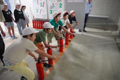 また、防災センターでは、起震車に乗って地震の揺れを体験したり、消火体験をしたりしました。